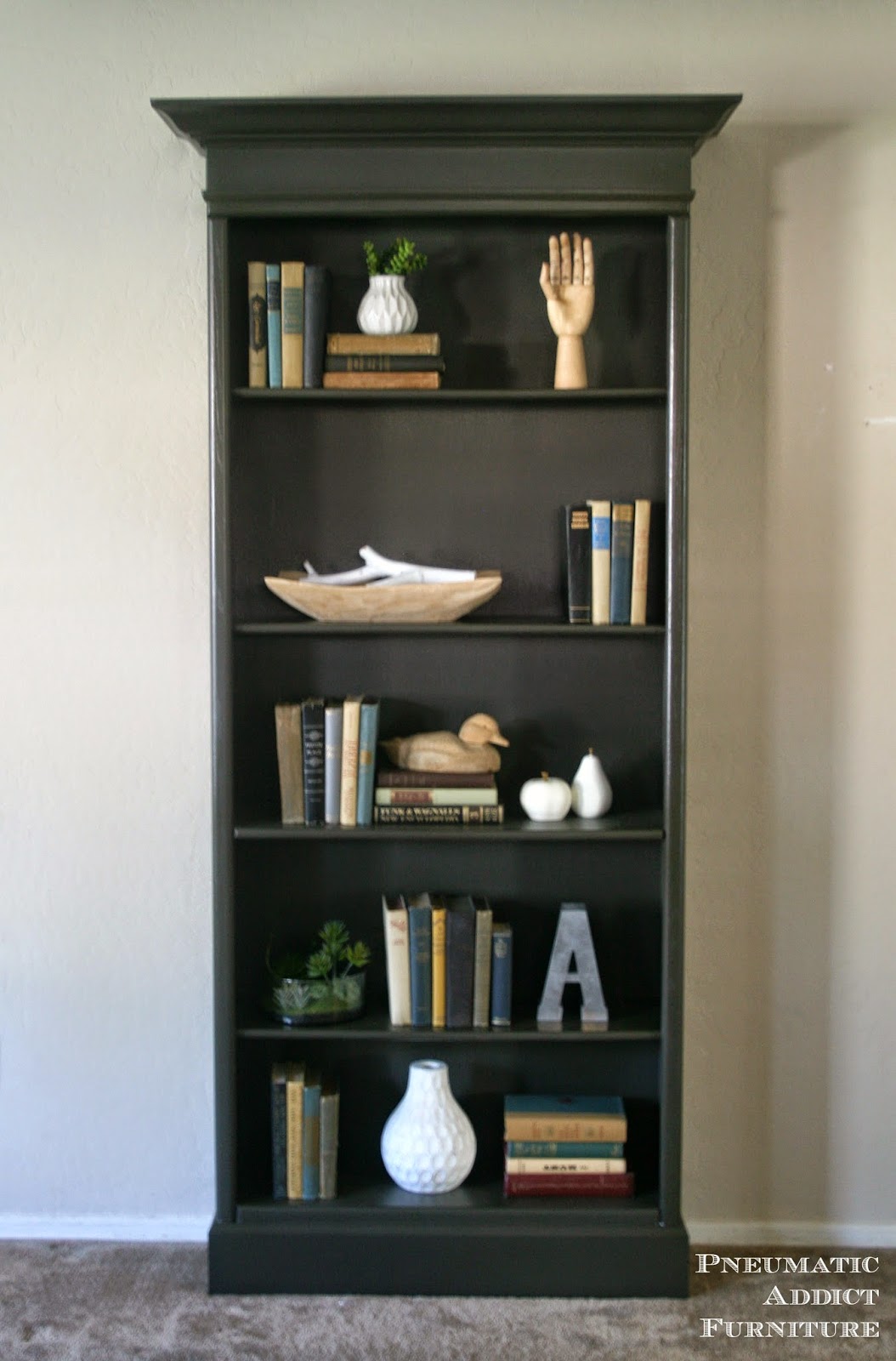 Now, all that is left is make-up. I primed both bookcases and all the shelves with a stain blocking primer. Then, I sprayed 2 coats of Dark Roast from Country Chic Paint (Yes, it is a chalk-based paint and I didn't need to prime, but the oak looked a little orange and I was worried about tannin bleed). Its pretty much my new favorite color. Its the dark, warm gray that goes with anything. Its perfect if you like an Industrial look. You can see my first project I used Dark Roast on, here. Since these bookshelves will see a lot of use, I sprayed 3 coats of satin lacquer to seal my new paint job.